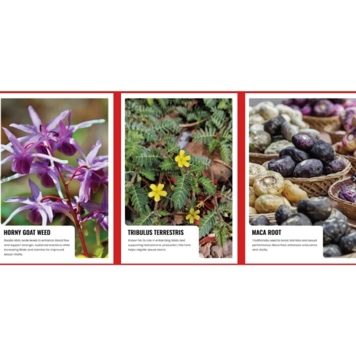 Key ingredients include Horny Goat Weed, Tribulus Terrestris, and Maca Root, each known for their effectiveness in enhancing male sexual health.